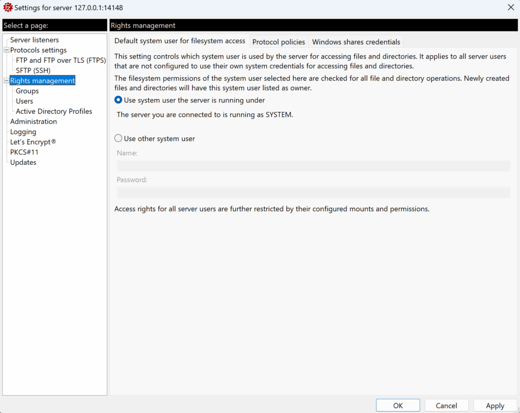 Rights management allows you to specify the system user for file and directory access, create FileZilla Pro Enterprise Server users and groups, and from version 1.10.0 to define Protocol policies and from version 1.11 to set Windows Shares.