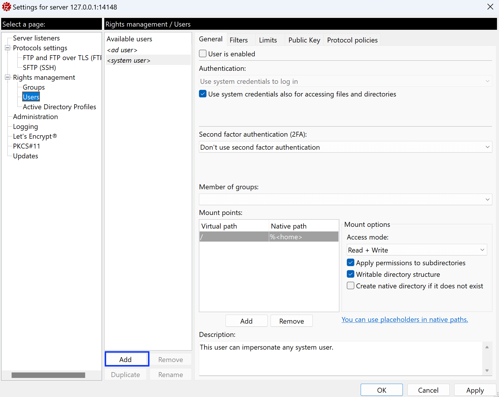 FileZilla Sever/FileZilla Pro Enterprise Server initially lists only the system user and the Active Directory user, both disabled by default to ensure no users are active at installation. You can add additional users at any time by clicking Add.