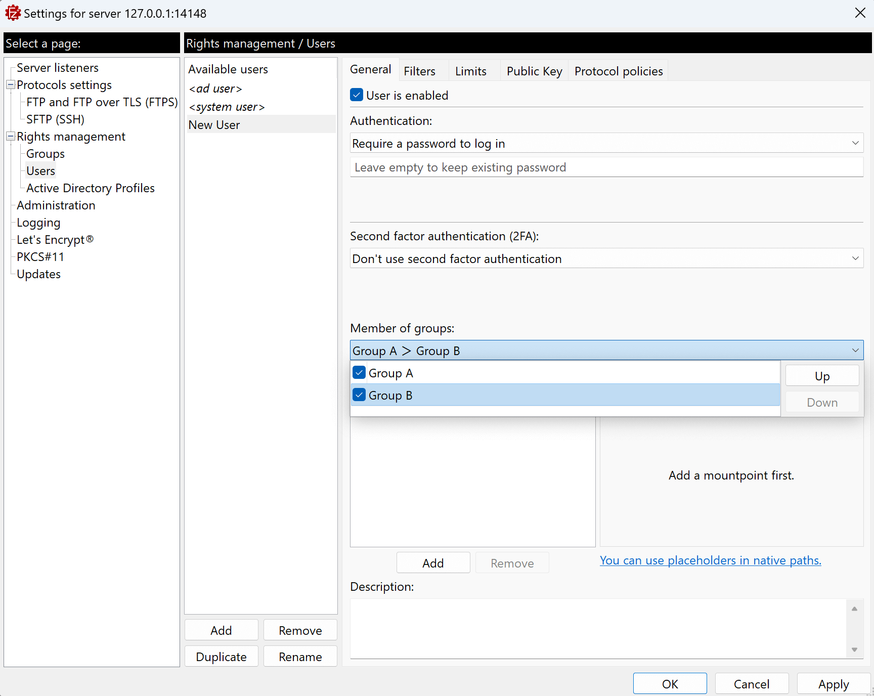 If the same mount point is defined both for a user and for any of the groups they belong to, FileZilla Server/FileZilla Pro Enterprise Server will use the one set for the user. If a mount point is defined in more than one group the user belongs to, FileZilla Server will use the mount point of the group that comes first, in the list of the groups the user belongs to.