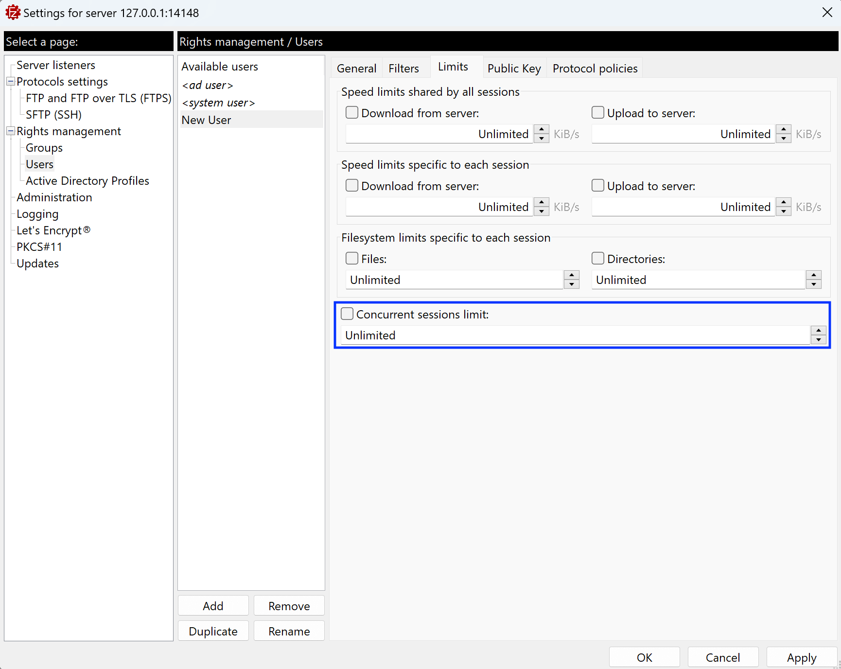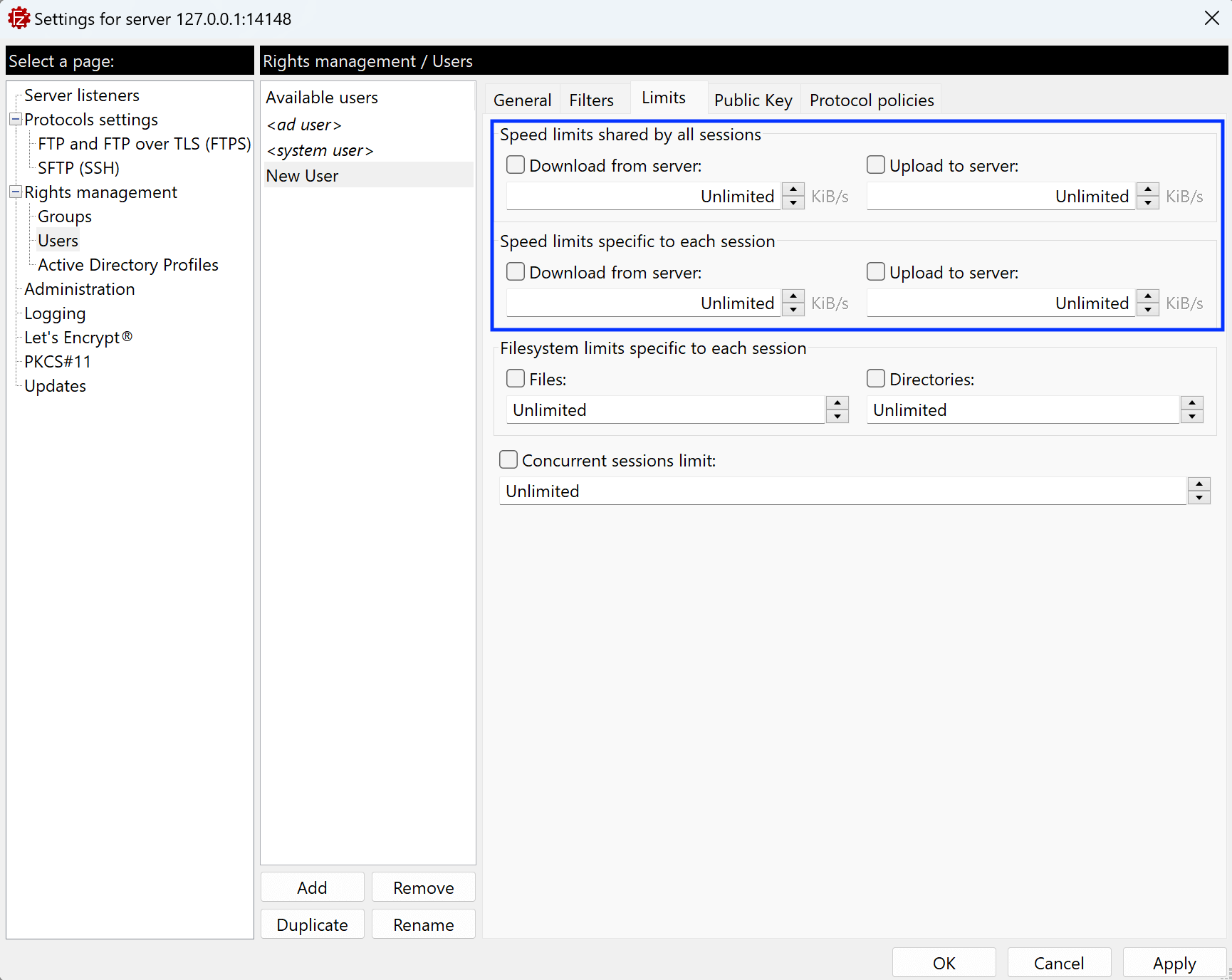 For example, if a per-session limit is set to 10 KiB/s and there are 5 active sessions related to the user, each session will be able to reach 10 KiB/s, resulting in a cumulative speed of 50 KiB/s for all sessions. On the other hand, if you set a shared-session limit to 10 KiB/s and have 5 active sessions related to the user, the combined speed for all sessions will be limited to 10 KiB/s