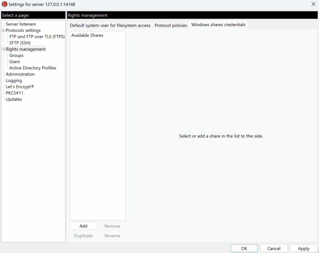The Windows Shares Credentials tab allows you to configure credentials for accessing an existing Windows share.