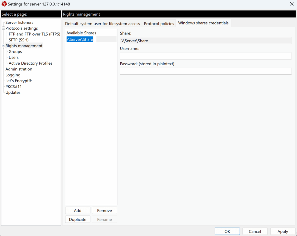 Once the share exists, click the Add button, enter the UNC path of the Windows share in the Share field, and then provide the corresponding Username and Password in the appropriate fields.