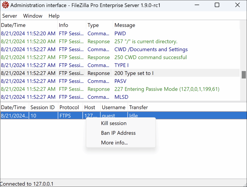 keyboard, to kill the session, ban the IP address or get more information about the session.