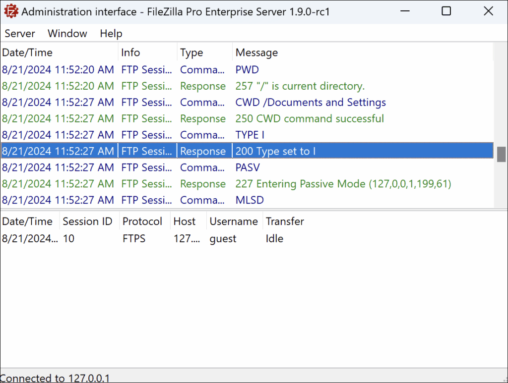 FileZilla Server keeps a log of its actions, and you can define the log level by setting the Logging level.