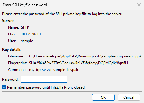 - In the profile settings in the Site Manager. If the SFTP Protocol is specified, it is possible to specify the Logon Type as Key File and specify the location of the private key file (in .ppk or .pem format – see below for conversion options from other formats.) The user is prompted for the password of the key file if necessary.