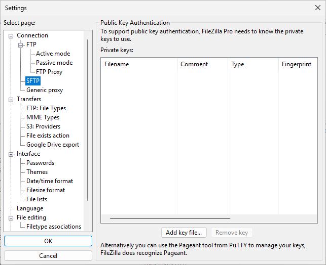 - (Windows only) Using PuTTY tools.To allow the use of RSA/DSA key files with FileZilla Pro, you’ll need two tools from PuTTY: Pageant and PuTTYgen (if your key file is not in PPK format).