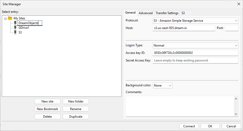 - Copy and paste the secret key into the Secret Access Key field in FileZilla Pro’s Site Manager window.