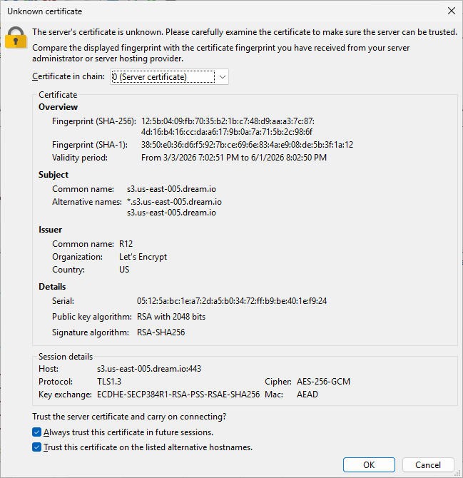 - FileZilla Pro checks the server’s TLS certificate and asks them to verify that the details are as they expect.