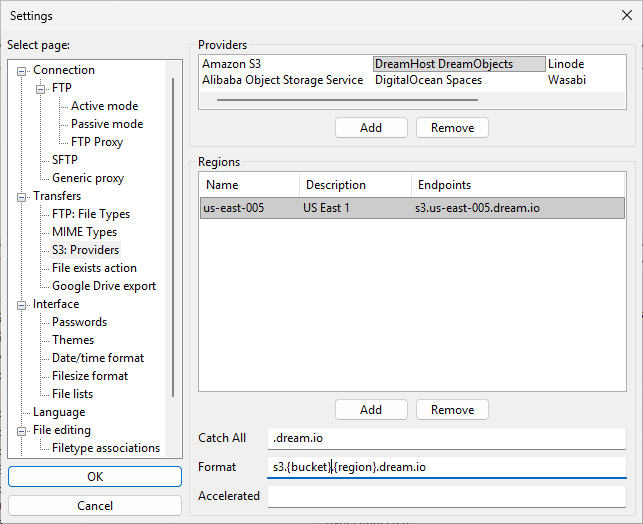 - Got the connection information directly from Dreamhost, and know that Dreamhost uses Amazon S3 cloud servers, so click OK.