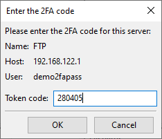 When connecting to the server, FileZilla Pro prompts the user to enter the code generated by the